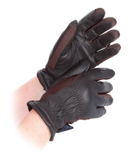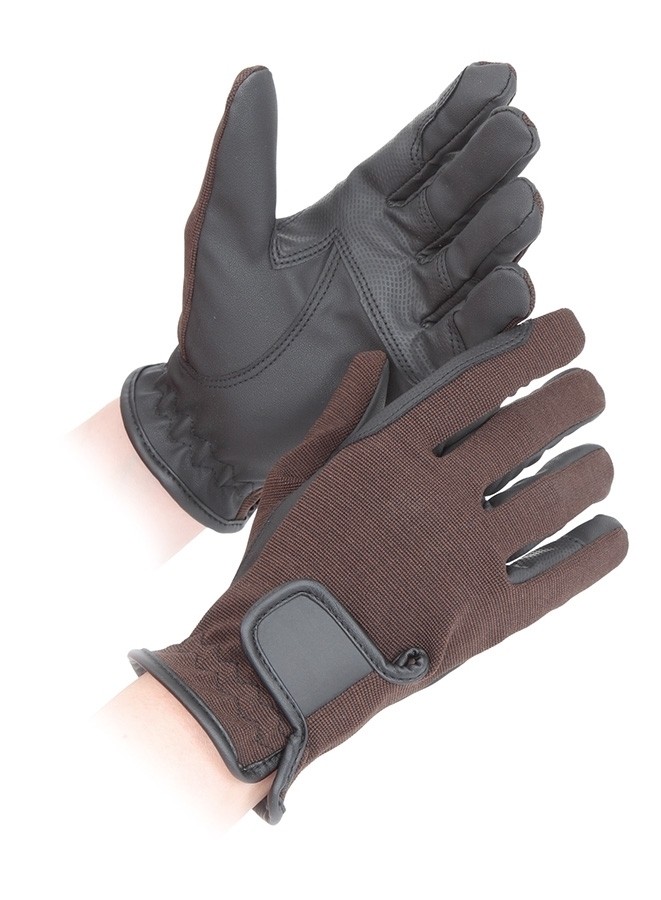 Synthetic leather gloves with breathable fabric backs, reinforced riding grips and adjustable wrists.