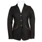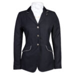 The Dressage Coat is an elegantly styled dressage coat. It’s made with a velvet collar and pocket flaps with fine silver piping. Tailored cut with stylish buttons. For best care, dry clean only.