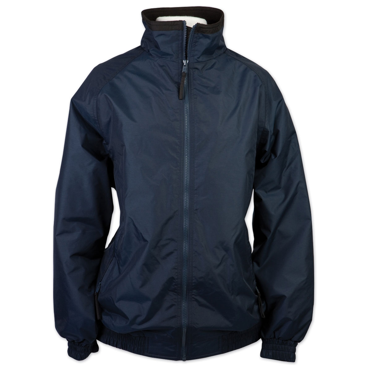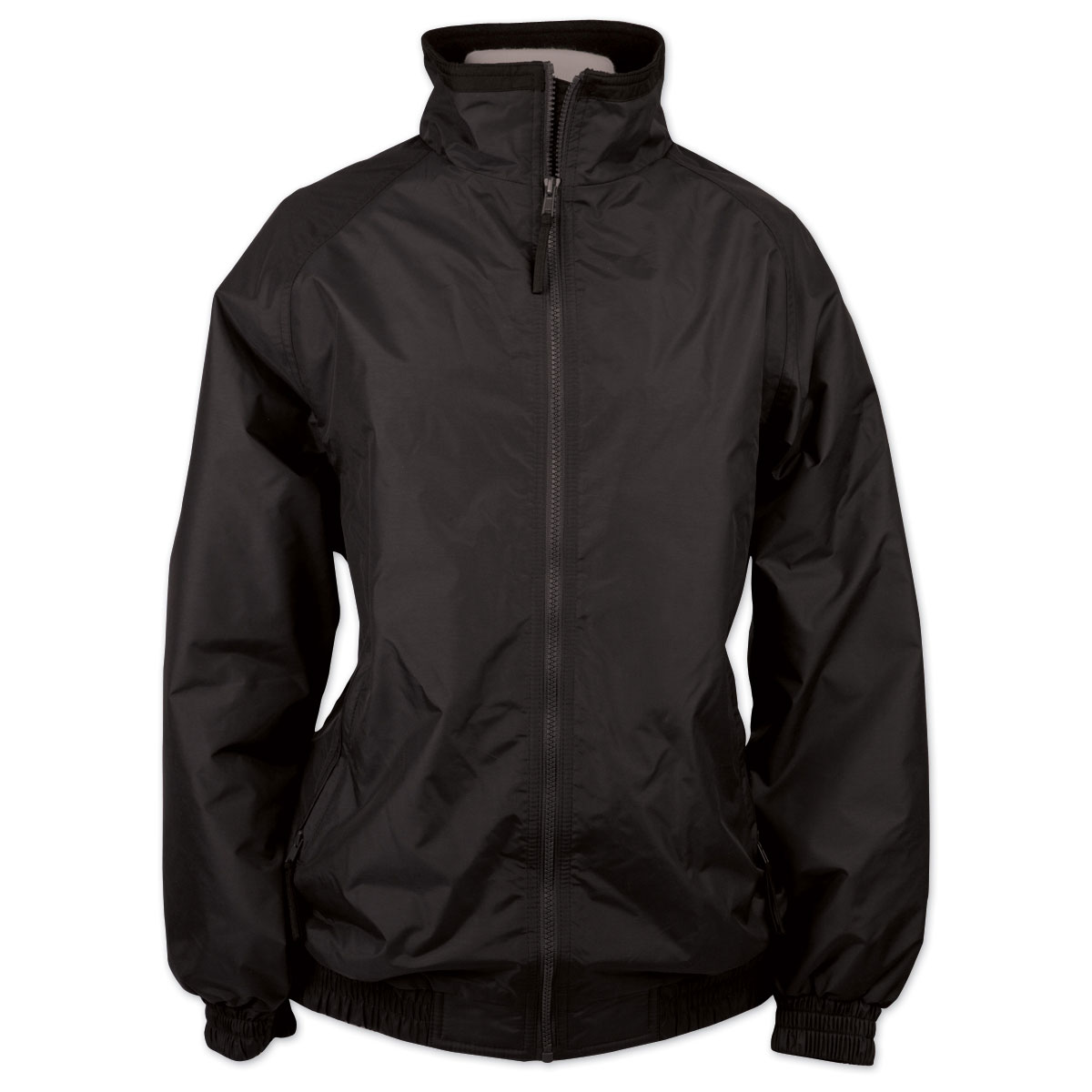 100% nylon shell jacket with anti-pill black microfleece lining. Wind and water resistant. Nylon poly sleeve lining. Outside zip pockets. Contrast tipped mock collar and inside zip guard. Full front zip.