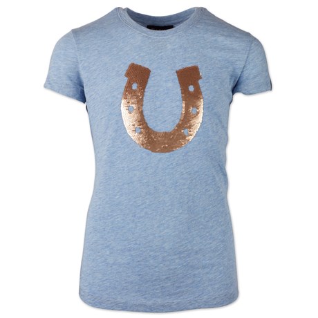 100% Cotton crew neck slub jersey tee featuring a two-way sequined horse shoe design!