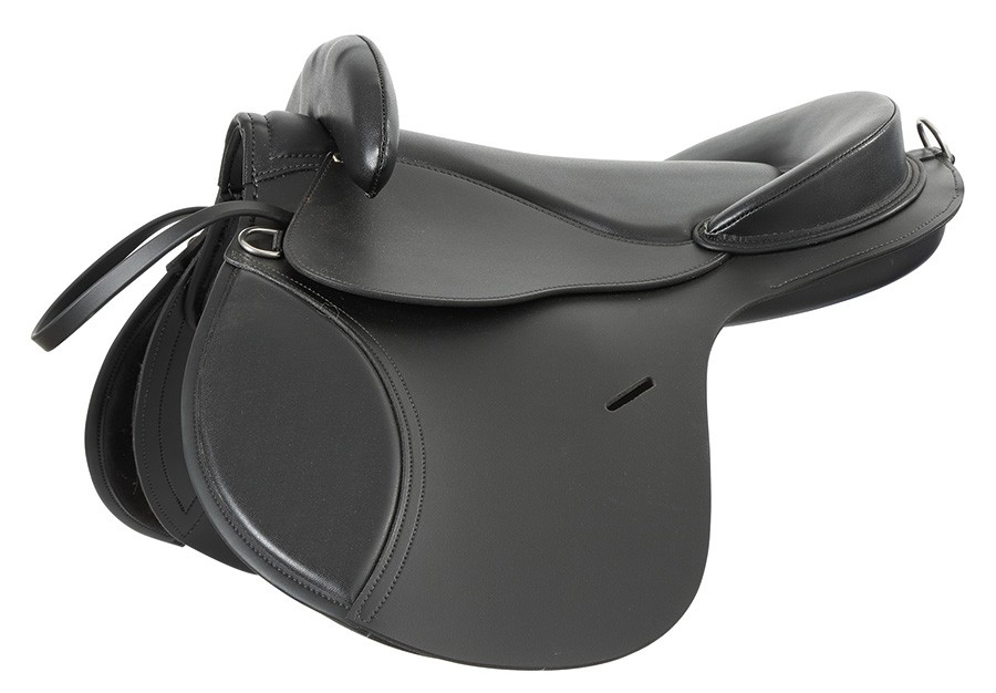 Comfortable padded, secure seat for young, novice riders balance strap for confidence building padded knee rolls detachable knee blocks front and rear D-rings two girth straps, PVC with polypropylene tree stainless steel stirrup bars